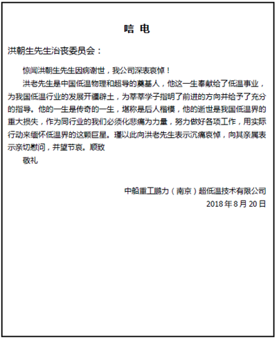 中船重工鵬力(南京)超低溫技術(shù)有限公司唁電