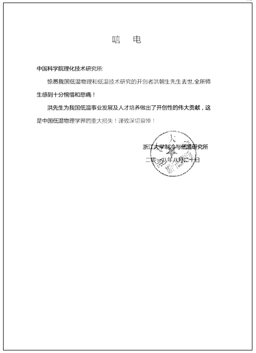 浙江大學制冷與低溫研究所唁電