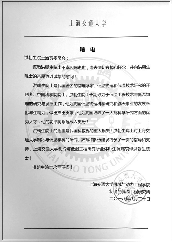 上海交通大學機械與動力工程學院制冷與低溫工程研究所唁電