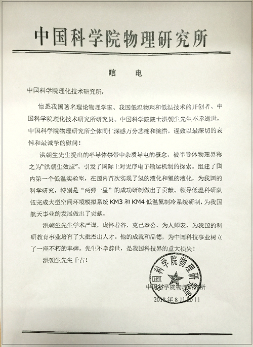 中國科學院物理研究所唁電